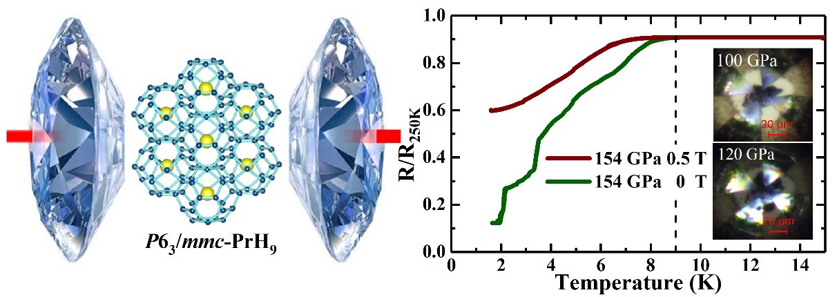 实现室温超导是超导学术界和工业界梦寐以求的终极目标。借助高压技术,创纪录的超导转变温度200 K和250 K分别在新型硫氢化物H3S和镧氢化物LaH10上得以实现,因此富氢化合物被认为是室温超导体的最佳候选体系。为了在富氢化合物中继续寻找潜在的高温超导体,同时探究镧系金属原子在超导转变中的作用,研究人员选取镨单质与不同的氢源,分别在“冷压”和“热压”两个路径下合成了多种新型镨氢化合物。其中,立方相-PrH9和六角相-PrH9均具有与LaH10、CeH9相似的氢笼构型,原位高压电阻测量结果显示其可能的超导转变温度低于9 K。通过进一步的理论计算结果发现镨氢化物中磁有序和电声相互作用在极接近的压力范围内共存,这可能是导致其超导转变温度较低的原因。本工作的研究结果表明,La-Ce-Pr系列氢化物的超导转变温度随La-Ce-Pr元素的原子量增加而下降。镧系非氢元素的加入不仅为“金属氢”的晶格提供电子稳定了氢笼构型,而且在决定超导转变温度中也发挥着极为重要的作用。该成果为高压下设计及制备新型超氢化合物及高温超导体提供了新的研究思路。