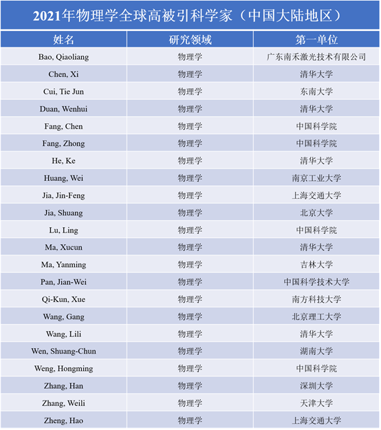 在物理学领域中国大陆地区共有14家机构的22位学者入选。马琰铭教授再次入选,这也是马琰铭教授连续第五年入选。