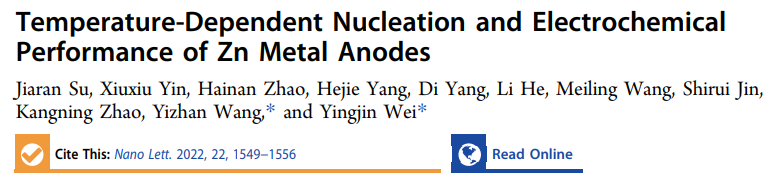 新型电池物理与技术教育部重点实验室魏英进教授、王义展教授团队在水系锌离子电池金属锌电极性能研究方面取得新进展。研究成果以“Temperature-Dependent Nucleation and Electrochemical Performance of Zn Metal Anodes”为题,发表在《Nano Letters》上。