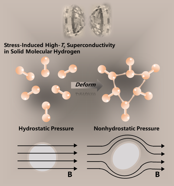 氢是最轻、原子结构最简单,以及宇宙中含量最多的元素。氢单质在常温常压下是由双原子分子组成的非金属气体。早在1935年,诺贝尔物理学奖得主E. Winger教授预言:氢单质在超高压强下可以转变为固态金属。1968年,美国科学院院士N. W. Ashcroft教授提出:金属氢是潜在的高温超导体。科研人员对探索金属氢的奥秘产生了浓厚的研究兴趣,并冠以其“高压物理学界圣杯”的美誉。然而,氢金属化所需的静水压强高达~ 400 GPa,严重地制约着晶体结构和电输运性质的测试研究,导致金属氢相关报道长期存在未知和异议。需要注意的是,超高压极端条件下(如 > 300GPa),实验样品腔内会不可避免地引入不均匀变形和各向异性应力,而这种非静水压环境对固态氢结构和物性的调控效应尚不清楚。