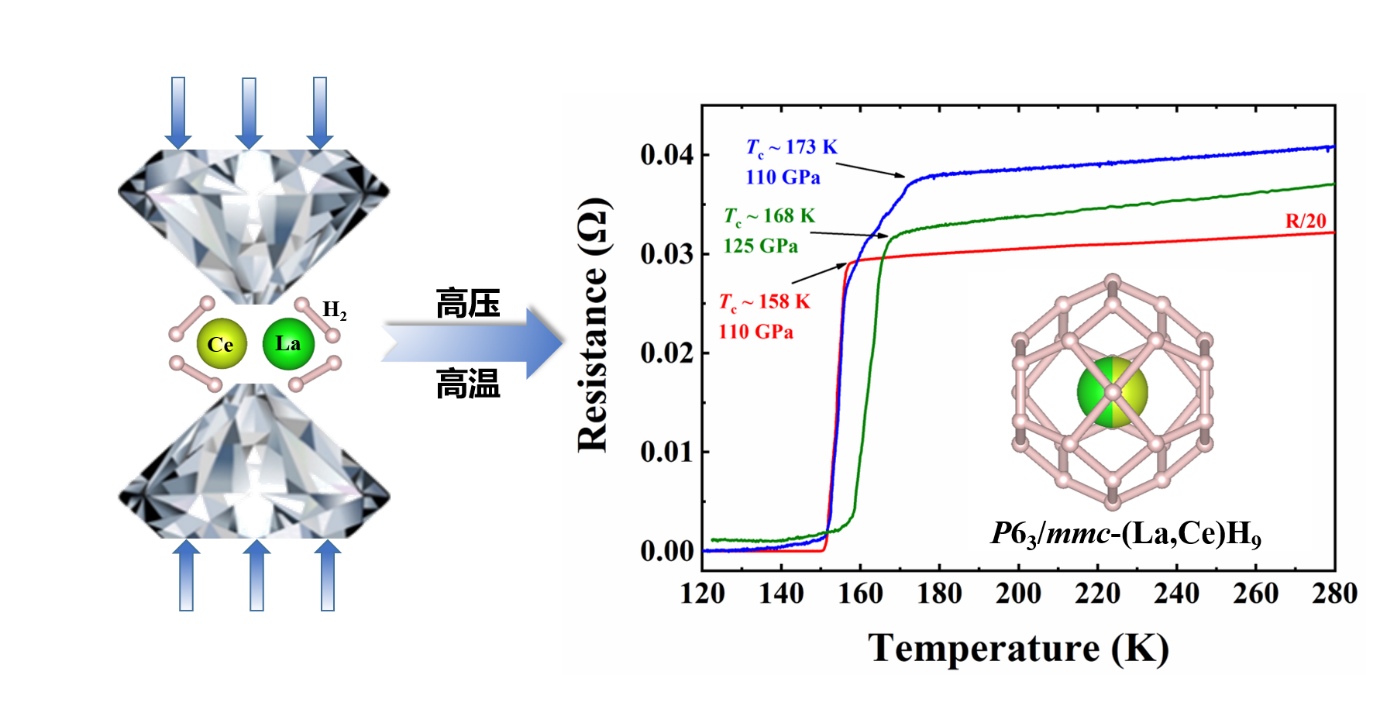 图:高压下 (La,Ce)H9的超导转变和结构示意图