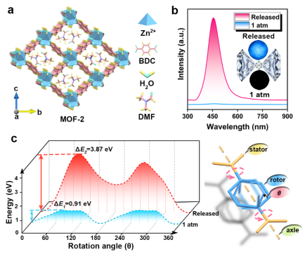 图:a) MOF-2的晶体结构,b) 压强处理前后MOF-2的荧光光谱和荧光照片,c) 压强处理前后BDC的旋转势垒。