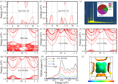 2. (a,b)分别为完美Bi2O2Se在0和30 GPa下的能带结构。(c) Bi2O2Se的EDX分析。(d) 4×4×2 Bi2O2Se超晶胞在0 GPa下的能带结构。(e-g)分别为含有Se空位的Bi2O2Se在0、15和30 GPa下的能带结构。(h) 30 GPa下含有Se空位的Bi2O2Se的PDOS。(i) Se原子在30 GPa下对费米表面的贡献。