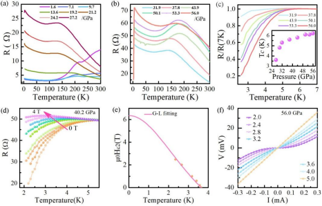 1. (a,b) Bi2O2Se在1.6至56 GPa不同压力下的电阻与压力关系。(c)压力高于31.9 GPa时在低温区归一化电阻(R/R(7K))与温度关系。插图描述了超导电性起始温度与压力之间的关系。(d)40.2 GPa下Bi2O2Se电阻-温度曲线随磁场的变化。(e)使用Ginzburg−Landau (GL)公式对Tc - H曲线的最佳拟合。(f) Tc附近不同温度下的V−I曲线。