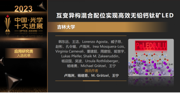 热烈祝贺免费看片 王宁教授团队发表在Nature上的论文“Tautomeric mixture coordination enables efficient lead-free perovskite LEDs” [Nature, 622,493-498 (2023)]入选“2023年中国光学十大进展(应用研究类)。该研究由王宁团队联合东南大学卢海洲、上海大学杨绪勇、洛桑联邦理工学院Michael Grätzel等人首次提出一种适用于稳定无铅锡基钙钛矿的普适性策略:通过互变异构体混合与钙钛矿配位,诱导Sn2+周围电子局域化,并自发的在钙钛矿表面形成准垂直、稳定的氢键互变异构二聚体和三聚体超结构,避免安德森局域导致的不利影响,有效提高钙钛矿晶体结构的有序性。制备的锡基钙钛矿LED峰值外量子效率达20.29%。该成果有望推动无铅钙钛矿LED领域的发展。