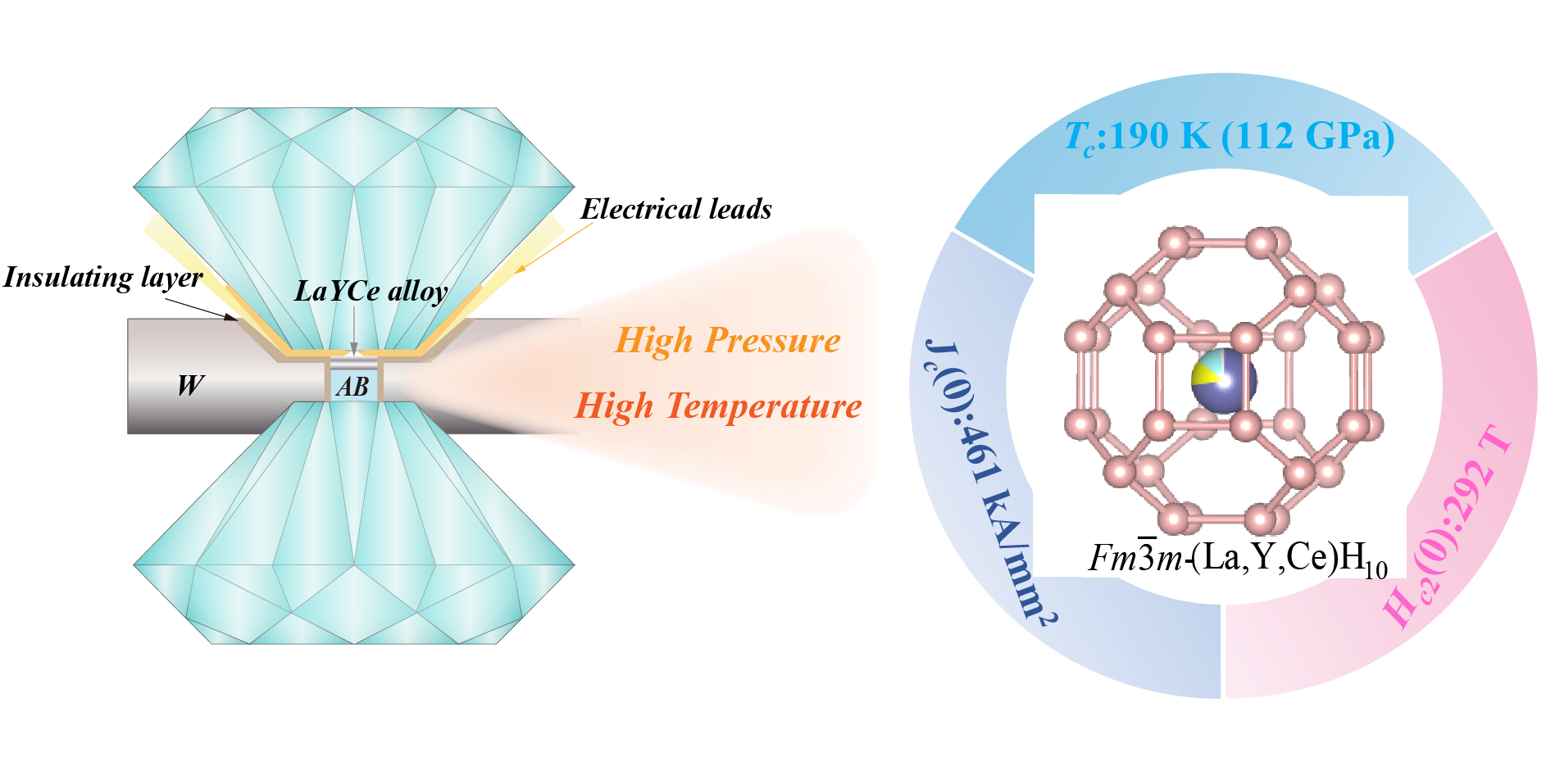 基于此,课题组进一步开发了新型四元超氢化物,旨在通过控制这些材料中组分配置,调节其稳定压力并增强超导性能。在112GPa的中等压力下,结合激光加热技术,成功合成了具有优异性能的四元富氢高温超导体Fm3m-(La,Y,Ce)H10。高压原位电输运实验测得该化合物在112GPa下具有190K的高温超导电性。值得注意的是,该四元氢化物还具有十分优异的性能:其μ0Hc2(0)达到292 T,Jc(0)超过4.61×107 A/cm²,均优于当前实验中已获得的氢化物。这些结果表明,多组分氢化物可以通过"熵工程"来显著增强超导性能,并调节其稳定压力。这项工作激发了对多氢化物超导体的实验探索,并为未来更多多样化氢化物材料中寻找室温超导体提供了参考。