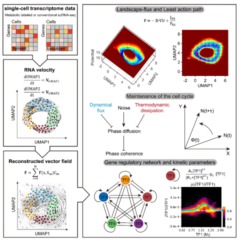 近年来,单细胞测序技术取得飞快的发展,使获得完整的转录组学数据成为可能。然而,从这些数据中理解生物功能背后的机制并确定控制细胞功能的转录调节的驱动力仍然具有挑战性。此研究通过离散的单细胞RNA速度来重建细胞周期的连续向量场,来量化细胞周期的非平衡全局驱动力--自由能景观和流。该工作揭示强噪声破坏细胞周期景观,遗传扰动改变了景观通量,从而确定了维持细胞周期动力学和预测相关功能效应的关键基因。此外,此研究量化了细胞周期起始的基本能耗成本,并揭示了维持细胞周期需要旋度流和热力学耗散来维持振荡相干性。最后,该研究能够直接从单细胞转录组学数据推断细胞周期的基因调控网络,包括反馈机制和相互作用。