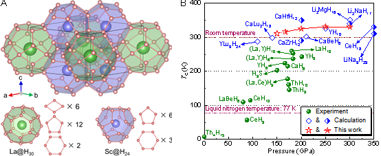 1:(A) 新型高温超导体LaSc2H24的晶体结构示意图。(B) 典型氢化物超导材料的超导温度与压强的关系,其中未填充和半填充的符号分别表示亚稳和稳定结构。