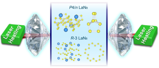 富氢化合物因具有高温超导电性,成为目前凝聚态物理体系关注的热点体系。前期的研究表明,固态氢和固态氮均属于双原子小分子固体,在高压下呈现了相似的结构和金属化转变趋势。目前高压下发现的二元超导体立方相LaH10具有最高的超导转变温度,在这个结构中32个氢原子形成了氢笼构型。那么将氢原子替换为氮原子是否具有类似的构型呢?聚合氮近些年来被评为最具有潜力的高能量密度材料,其在作为爆炸物和推进剂等领域均具有一定的应用价值。而金属原子的引入会显著调控聚合氮的结构,使其呈现出不同的聚合构型,从而具有奇特的性质。