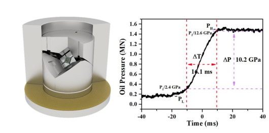 )对于新型材料的制备、物质亚稳相转变、相变动力学及压缩科学的研究具有重要的科学意义,在物理、材料、化学、地球及交叉科学领域具有广阔的应用前景。介于传统静高压(等温过程)和动高压(等熵过程)之间的毫秒级增压过程是一种特殊的物理加压方式,对材料的耐冲击等服役性能提出更为苛刻的要求,提高其快速增压水平在国际上的研究极具挑战,相关报道较少。国内外研究团队基于活塞圆筒和布里奇曼大腔体高压模具,针对毫米级样品,先后在20-100ms内实现了5-5.8GPa的压力加载,在非晶材料的制备和材料的物性参数等研究取得了重要进展。然而,如何控制压力加载速率、提高压力加载极限来探索和制备新型材料仍是压缩科学领域的重要难题。