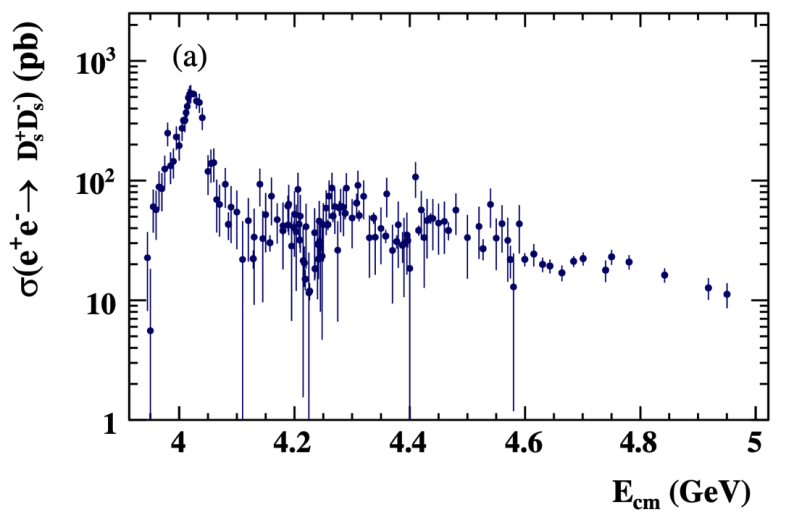 宋维民教授课题组及合作者利用北京谱仪实验获取的世界上最大的粲能区正负电子对撞样本,以前所未有的精度测量了e+e →Ds+Ds过程的反应截面,截面的形状揭示了粲夸克偶素的诸多非平庸的新性质,尤其是在能量为4.23 GeV处截面有一个极小值、在能量为4.7 GeV左右截面呈现凸起结构,上述新现象是新粒子、新机制存在的有力证据。