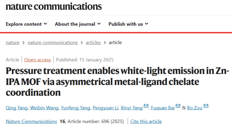 近日,免费看片 高压与超硬材料全国重点实验室/综合极端条件高压科学中心杨新一教授等人基于压强处理工程调控Zn-IPA金属-有机框架(MOFs)材料的结构刚性和配位构型,实现了Zn-IPA高效荧光/磷光混合型白光发射。相关成果以“Pressure treatment enables white-light emission in Zn-IPA MOF via asymmetrical metal-ligand chelate coordination”为题发表在《Nature Communications》(Nat. Commun. 2025, 16, 696)上。