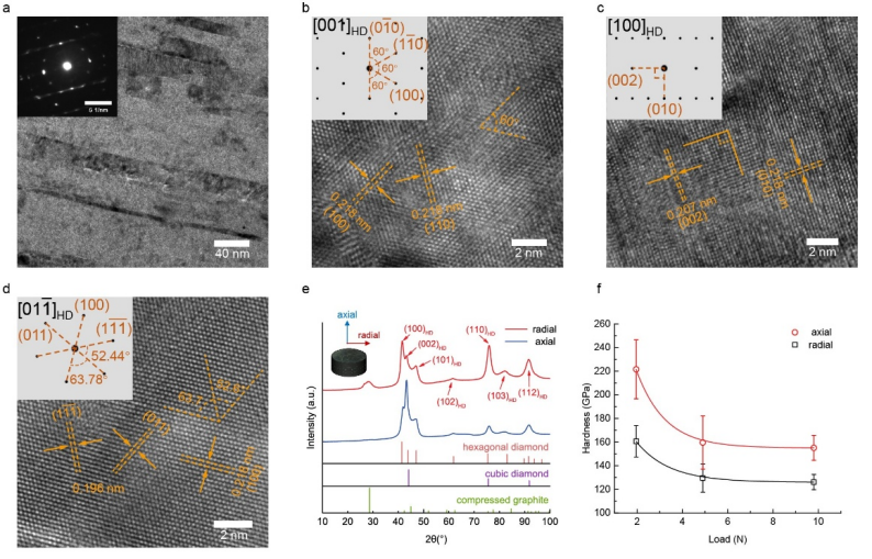 3. 高取向六方金刚石块材的透射电镜照片、XRD以及维氏硬度测试
