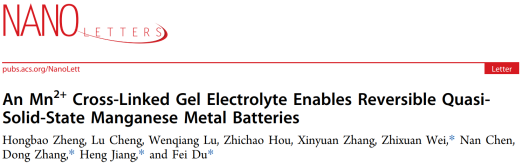 近日,免费看片 新型电池物理与技术教育部重点实验室杜菲教授团队在水系锰金属电池研究方面取得重要进展,相关成果以“An Mn2+ Cross-Linked Gel Electrolyte Enables Reversible Quasi-Solid-State Manganese Metal Batteries”为题发表在《Nano Letters》上。