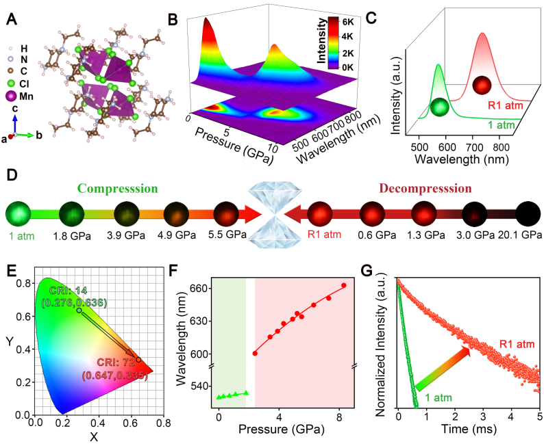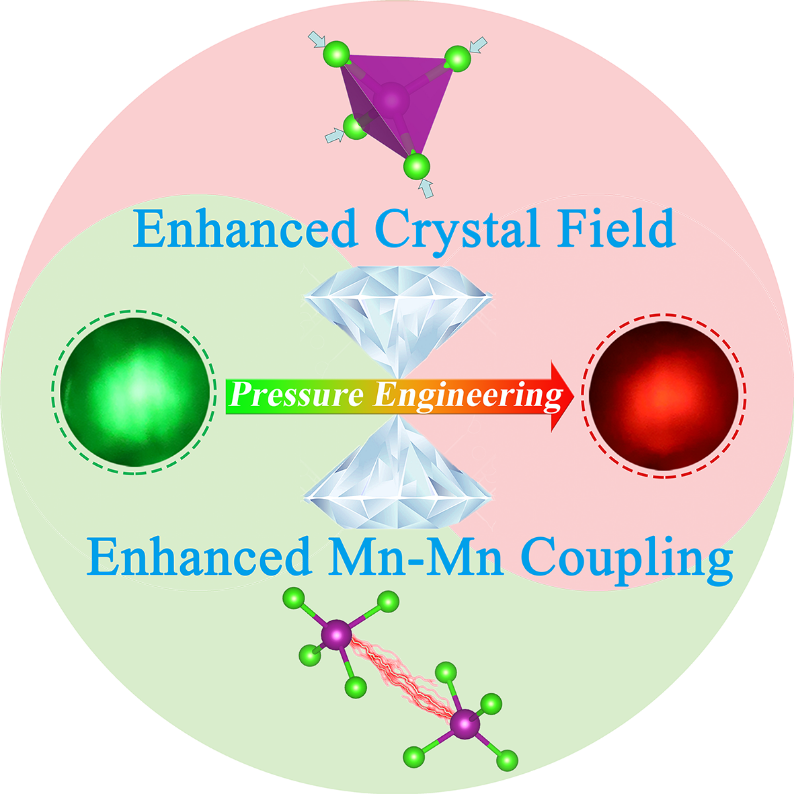 白光发射二极管 (WLED) 因其多场景应用而成为重要的新一代固态光源之一。然而,由于缺乏具有高显色指数 (CRI) 的红光发射组分,WLED 通常会发出刺眼的白光。开发一种在蓝光区域具有强吸收能力并在红光区域有效发射的红光发光材料是一项挑战。压强可以通过改变材料的晶体结构和电子构型,进而有效调控材料的物理和化学性质。尽管一些锰基相关的金属卤化物在高压下实现红色发射的研究已有报道,但是其红色发射在压力完全释放后消失,这在很大程度上抑制了这种材料的实际应用。因此,探索经压力处理后仍能保持高效红光发射性能的锰基金属卤化物具有重要的研究意义与应用价值。