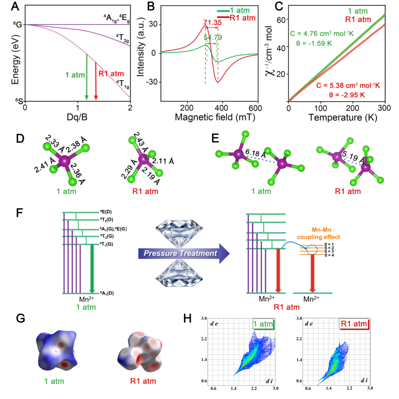 图 4. 压力处理前后(C6H14N2)MnCl4的Tanabe-Sugan (T-S) 图、电子顺磁共振谱、磁化率测量谱、分子动力学模拟的局域结构、Hirshfeld表面分析和2D指纹图,以及压力工程处理后(C6H14N2)MnCl4中红光截获的机理示意图。