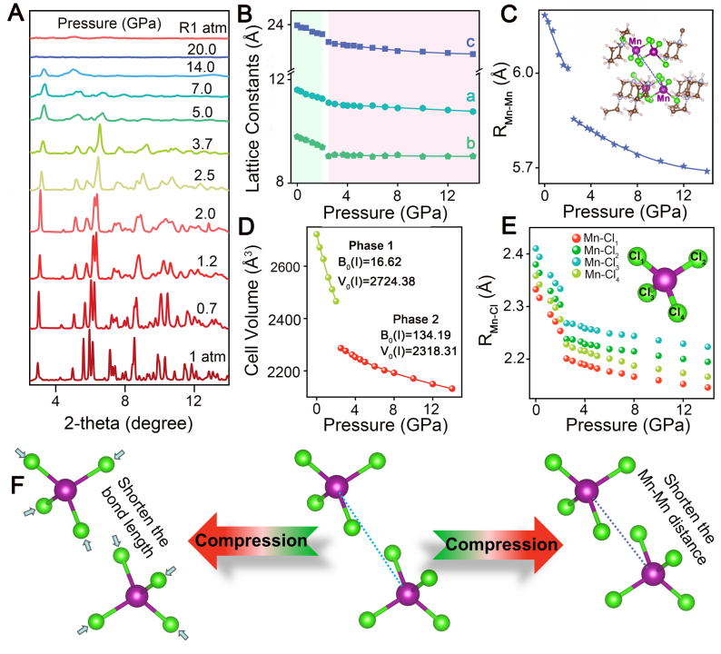 图2. 高压下(C6H14N2)MnCl4的结构变化及局域结构中Mn-Mn 距离和 Mn-Cl 键长减小的示意图。