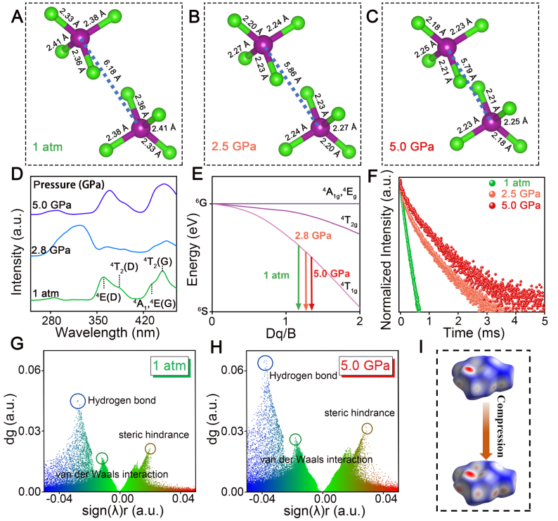 图 3. 不同压力下(C6H14N2)MnCl4的结构示意图、激发光谱、Tanabe-Sugan (T-S) 图、时间寿命衰减曲线、IGM等值面分析和 Hirshfeld 表面分析。