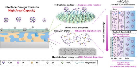 水系锌离子电池凭借环境友好、安全性高、成本低廉等突出优势,逐渐成为大规模储能技术的重要方向。然而锌阳极存在严重的枝晶和副反应问题,使其无法满足高面容量和深度放电条件下稳定循环的实际应用需求。实现高面容量下的稳定循环,关键在于调控锌的取向生长并加速界面离子传输,以抑制耗尽区形成。