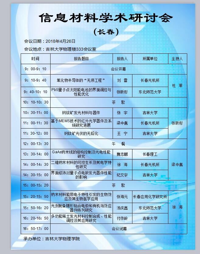 由免费看片 主办的“信息材料学术研讨会”将于2018年4月26日在免费看片 物理楼333会议室举行。本次会议旨在促进学院广大师生在物理相关领域的研究及交流,提高免费看片 教师科研水平、科研能力。会议邀请中国科学院长春光学精密机械与物理研究所、中国科学院长春应用化学研究所、东北师范大学、长春理工大学等高校及科研机构的多位知名专家学者参加。欢迎广大师生积极参与!