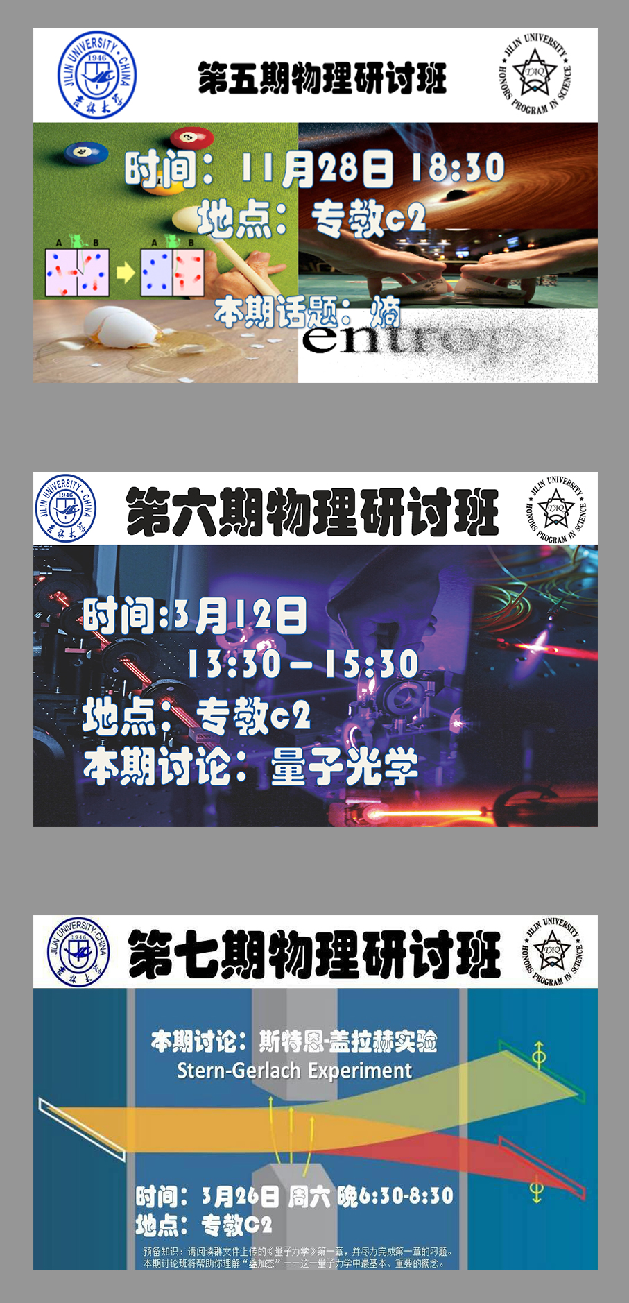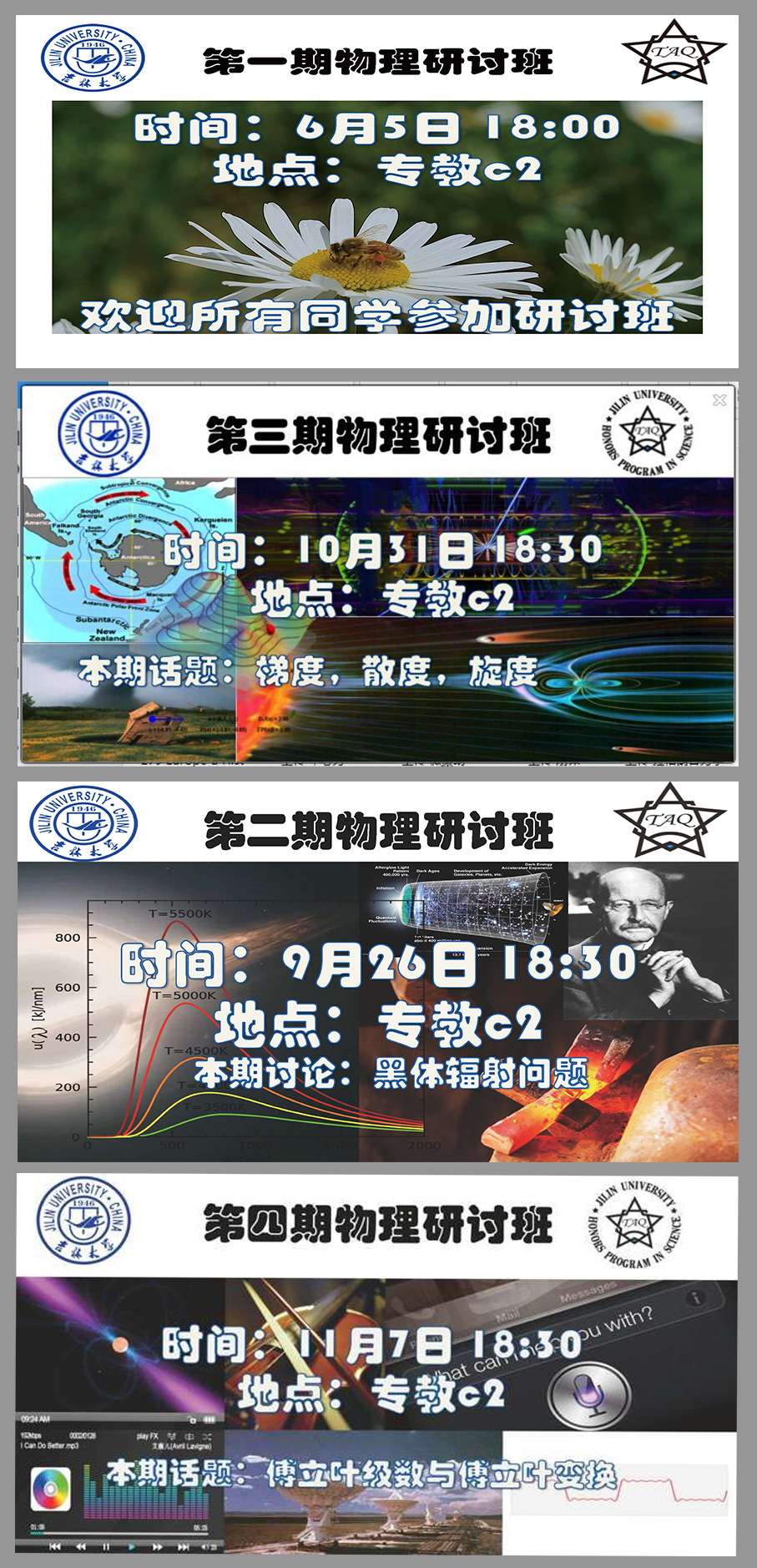 物理研讨班”目前已举办了七期,内容涉及“玻色爱因斯坦凝聚”,“黑体辐射”,“梯度,旋度,散度”,“傅立叶级数与傅立叶变换”,“熵”,“量子光学(光与原子相互作用)”,“斯特恩-盖拉赫实验”等等,每期活动时长约为2个小时,得到了免费看片