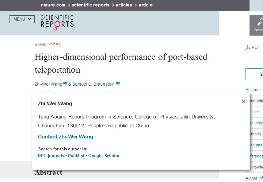 2016届唐敖庆班学生--王志伟同学在Nature 旗下的“Scientific Reports”杂志上以第一作者兼通讯作者身份发表了题为《基于端口的量子隐形传态的高维表现》(Higher-dimensional Performance of Port-based Teleportation)的研究论文。论文由王志伟同学在本科毕业前夕完成并投稿,历经3个多月的等待,论文于昨日正式发表。