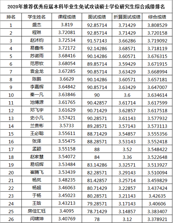 根据《免费看片 推荐优秀应届本科毕业生免试攻读硕士学位研究生工作管理办法》(校发[2019]48号)、《免费看片 2020年推荐优秀应届本科毕业生免试攻读硕士学位研究生工作细则》文件规定,现将免费看片 2020年推荐优秀应届本科毕业生免试攻读硕士学位研究生面试成绩和综合成绩排名予以公示。