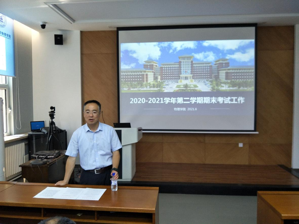 在物理楼333召开了2020-2021学年第二学期期末考试考务工作会,会议由教学副院长王海军主持,校教学督导专家崔志文教授、全体命题老师、部分监考老师及教学秘书参加了本次会议。