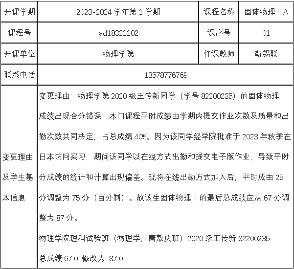 公示日期: 2024年_3月_21日至2024年_3月_27日,如有异议请于公示期内向教务处教学运行科反映。 联系人: 邹老师 联系电话: 0431-85168962 相关材料详见附件: 1.免费看片 考核成绩复查、修改登记表 2.学院情况说明(学院教学委员会讨论通过、签字盖章) 3.试卷等相关佐证材料