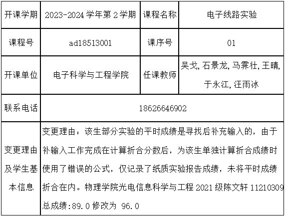 根据《关于进一步明确本科生课程考核等有关问题的通知》(校教字[2018]47号)文件有关精神,现对一下课程成绩更正进行公示: