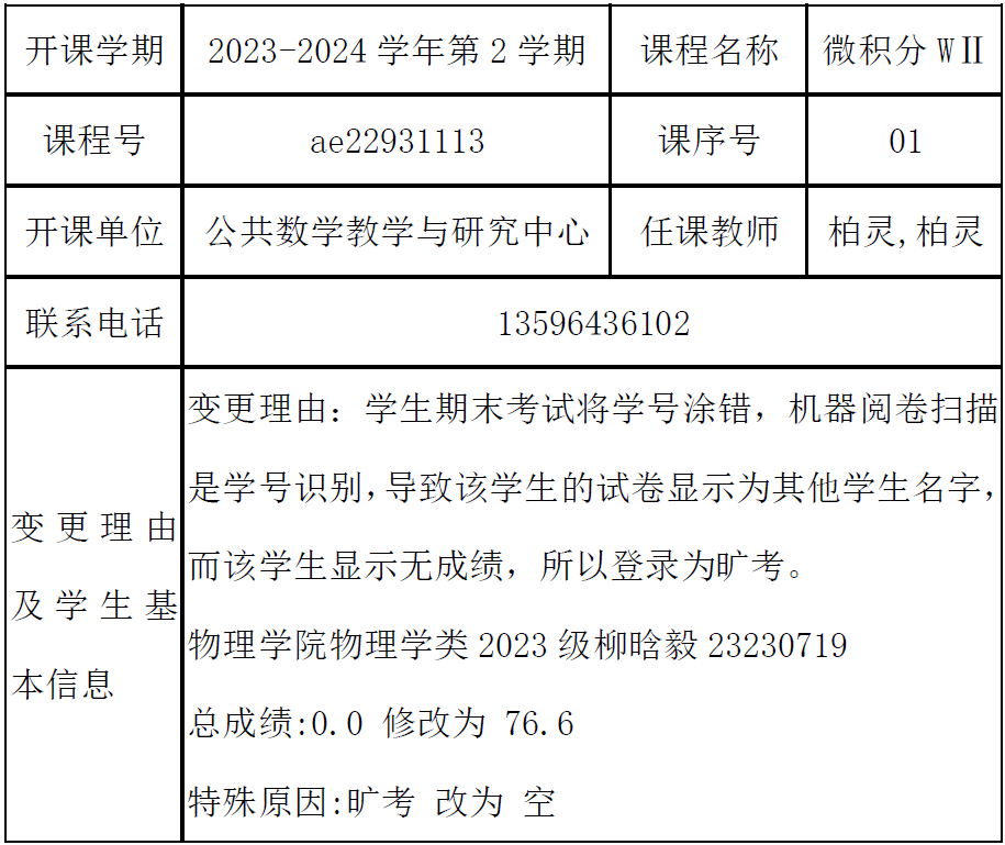 根据《关于进一步明确本科生课程考核等有关问题的通知》(校教字[2018]47号)文件有关精神,现对一下课程成绩更正进行公示: