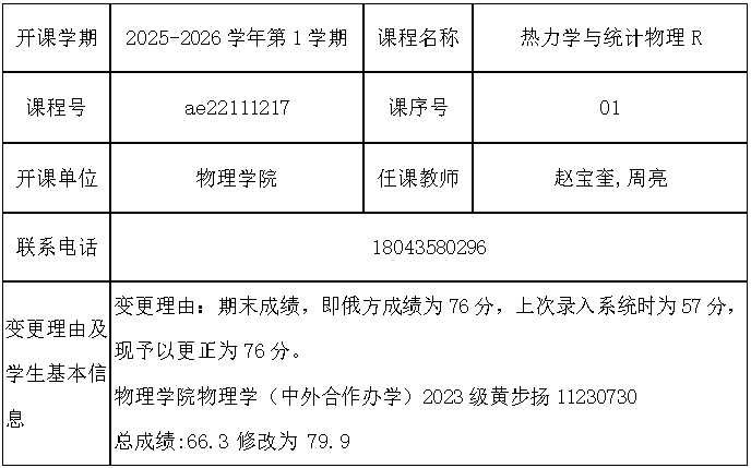 根据《关于进一步明确本科生课程考核等有关问题的通知》(校教字[2018]47号)文件有关精神,现对以下课程成绩更正进行公示: