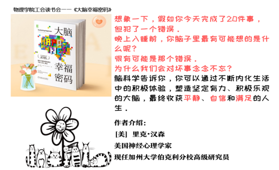第六期是美国神经心理学家里克·汉森的《大脑幸福密码》,用脑科学知识告诉我们,可以通过不断内化生活中的积极体验,塑造坚定有力、积极乐观的大脑,最终收获平静、自信和满足的人生。