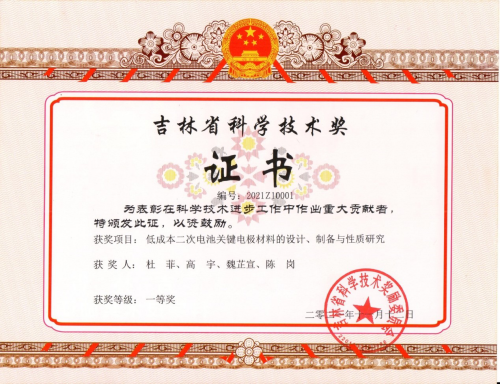 杜菲教授研究团队完成的“低成本二次电池关键电极材料的设计、制备与性质研究”研究成果荣获吉林省自然科学奖一等奖。