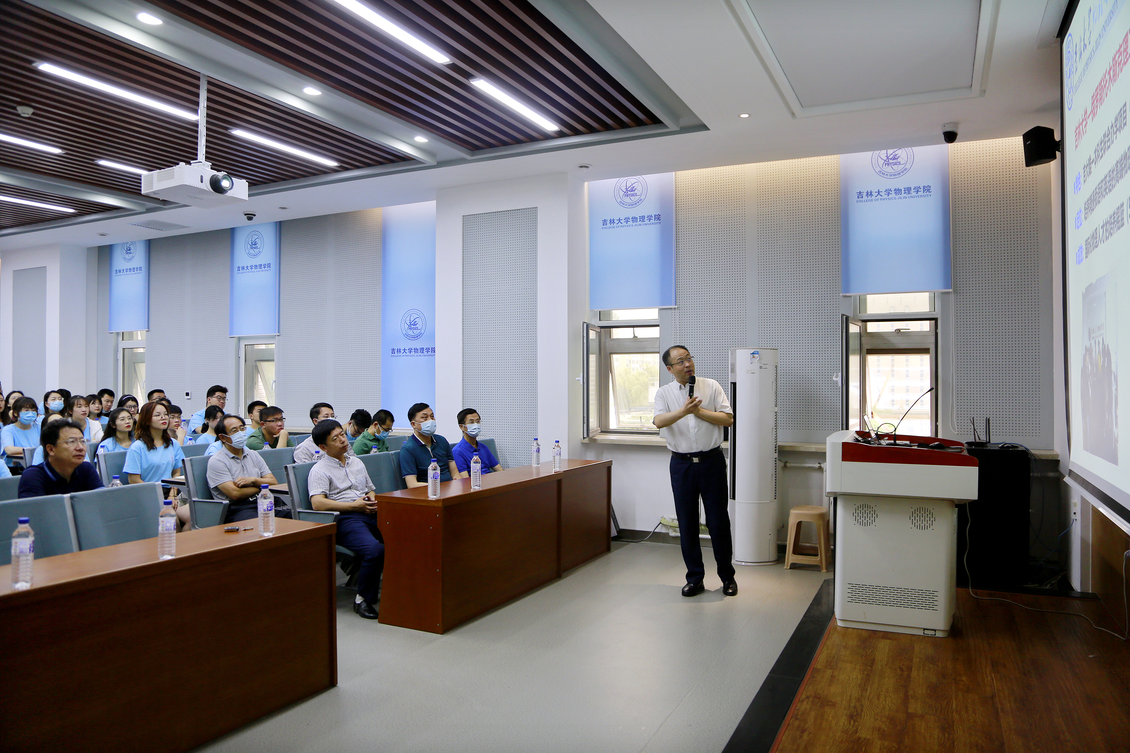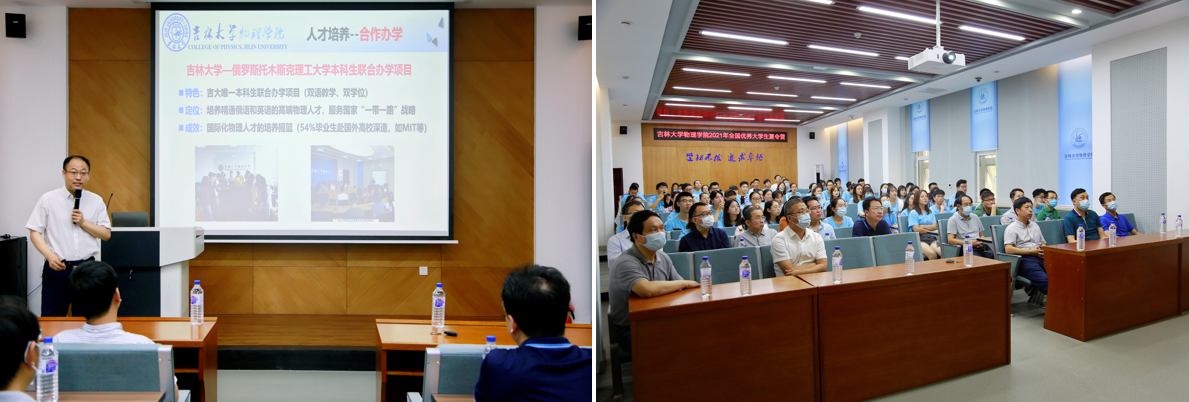 副院长孙成林主持,学院院长马琰铭、副书记、纪委书记唐宗明、副院长杨景、副院长王彦超、各系中心主任和教师代表参加。学院院长马琰铭致词,他代表全院师生欢迎全国各高校优秀学子,从辉煌的发展历程、优越的办学条件、鲜明的科研优势、“坚韧不拔,追求卓越”的学院精神等方面介绍吉大物理,诚挚邀请广大优秀学子加入吉大物理大家庭,共同为学院建设添砖加瓦,助力学院一流学科建设迈上新台阶。