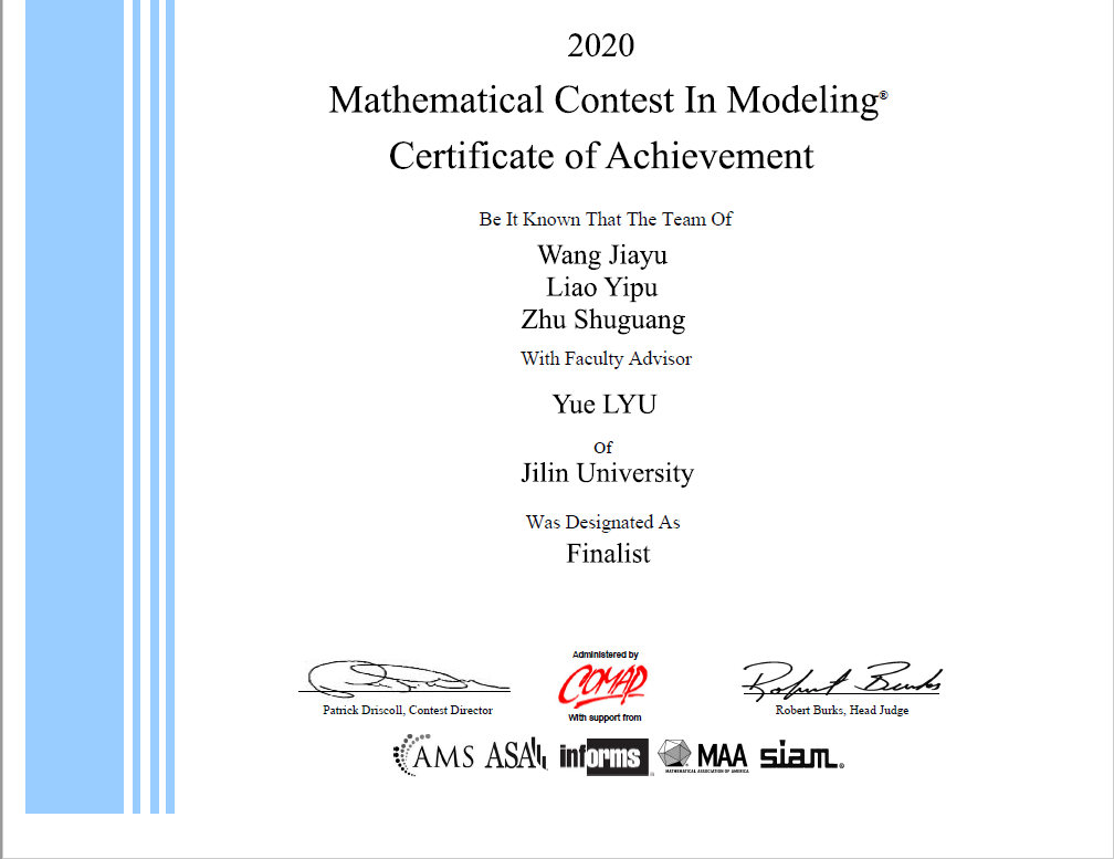 图1:2020美赛“特奖提名”(Finalist)队伍获奖证书