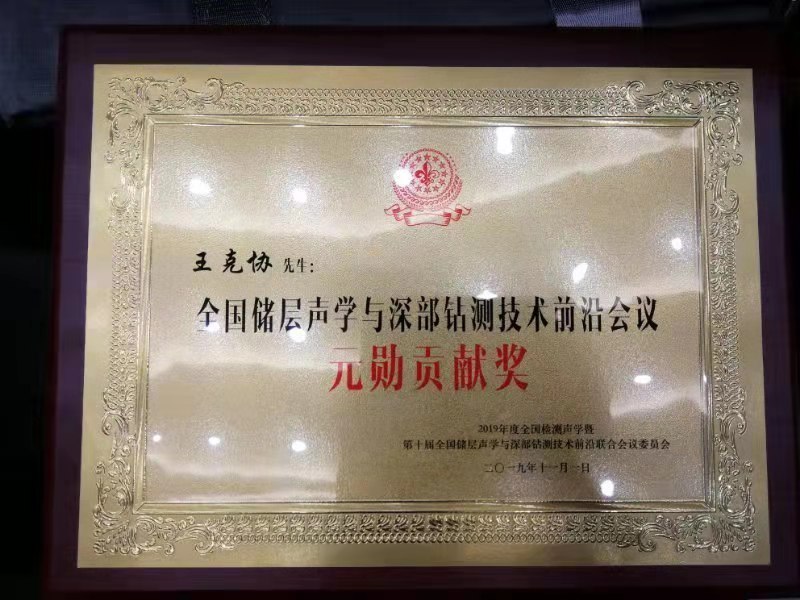 王克协教授在2019年度全国检测声学和第10届全国储层声学与深部钻测技术前沿联合会议上被授予“元勋贡献奖”。以此表彰王克协教授多年来在检测声学和无损检测、储层声学与深部钻测等领域中的科学研究、学科建设、教书育人、科学传播、学术交流和行业合作等多个方面做出的突出贡献。