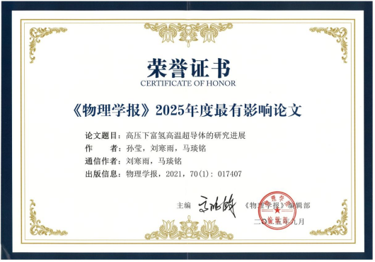 孙莹、刘寒雨、马琰铭(院士)共同撰写的综述论文《高压下富氢高温超导体的研究进展》(物理学报70, 017407 (2021)),凭借其卓越的学术价值和广泛的领域影响力,荣获《物理学报》2025年度最有影响论文奖(同年度共8篇获奖论文)。团队代表孙莹出席会议并上台领奖。