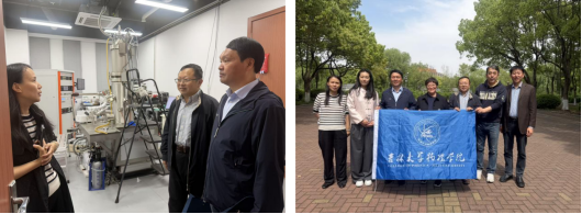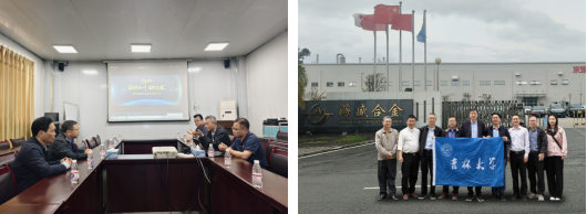 随后,一行人前往赣州海盛钨业股份有限公司。在董事长曾庆宁陪同下,走进生产车间,全程观摩碳化钨产品生产工艺,细致学习企业技术研发与生产管理的成熟做法。座谈中,双方就实习实践基地建设、高盐废水处理技术攻关等事宜深入探讨。邹勃表示,海盛钨业产业链完整、技术实力雄厚,为学院人才培养提供了优质实践平台,恳请曾庆宁多为学院发展与学科建设提出宝贵意见。杨景对校友以物理功底深耕实业、心系母校的情怀表示感谢。