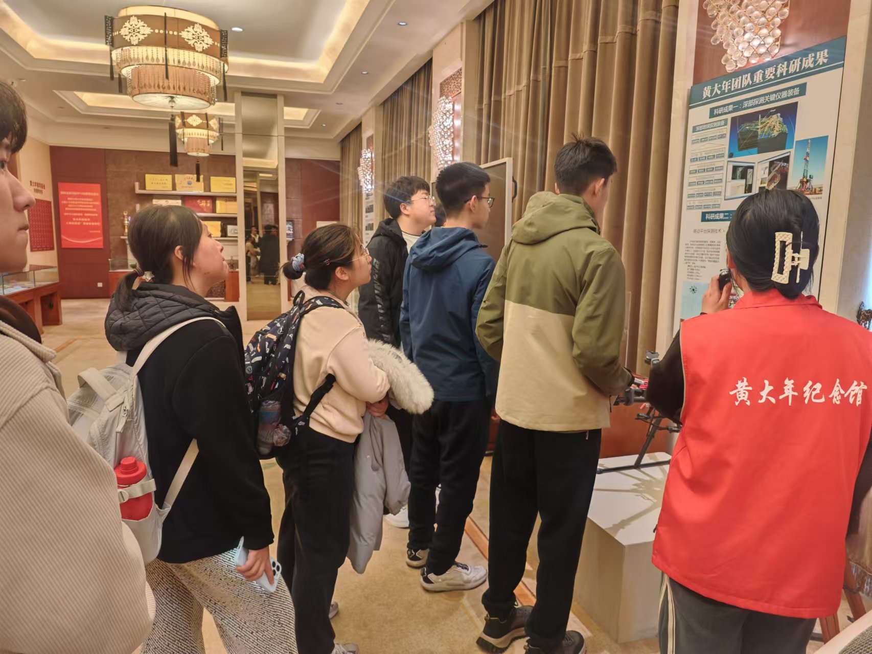 在纪念馆中,一幅幅珍贵的图片、一件件真实的遗物,生动地展现了黄大年老师心有大我、至诚报国的爱国情怀;教书育人、敢为人先的敬业精神;淡泊名利、甘于奉献的高尚情操。同学们认真聆听讲解员的介绍,不时驻足观看,被黄大年老师的事迹深深感动。