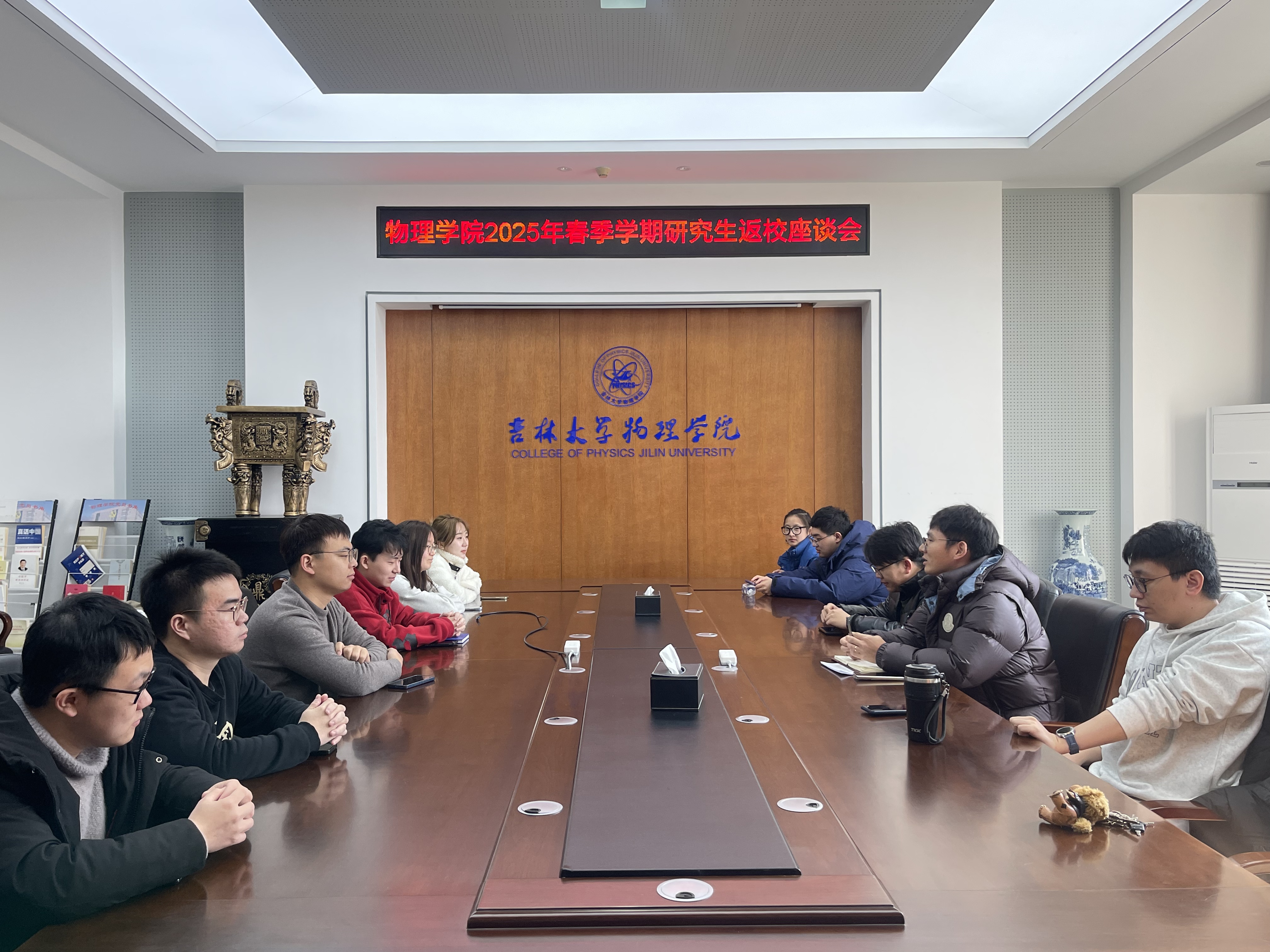 在物理楼301会议室召开2025年春季学期返校研究生座谈会。各年级博士、硕士研究生代表12人参加,会议由研究生辅导员曹鹏老师主持。