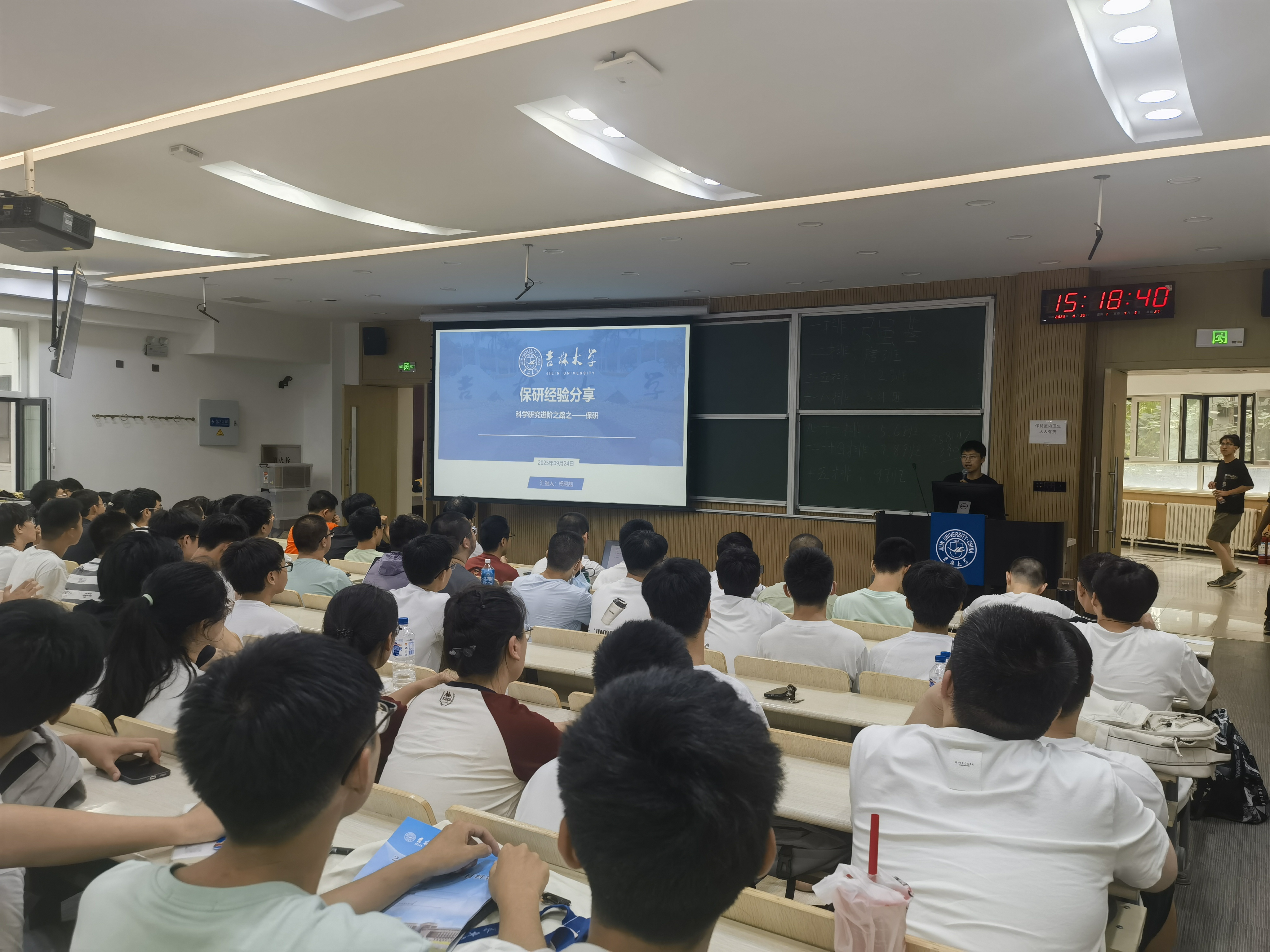 辅导员刘扬让大家了解到未来毕业时更多的可能性,他展示了往届毕业生去向的相关数据,极大地鼓舞了新生斗志,让他们的目标更加明晰。同时,刘扬老师引导新生关注学科竞赛,提前积累科研与实践经历,鼓励大家为未来发展蓄力。他还邀请了学院优秀学生代表2021级学生杨珺喆作保研经验分享。